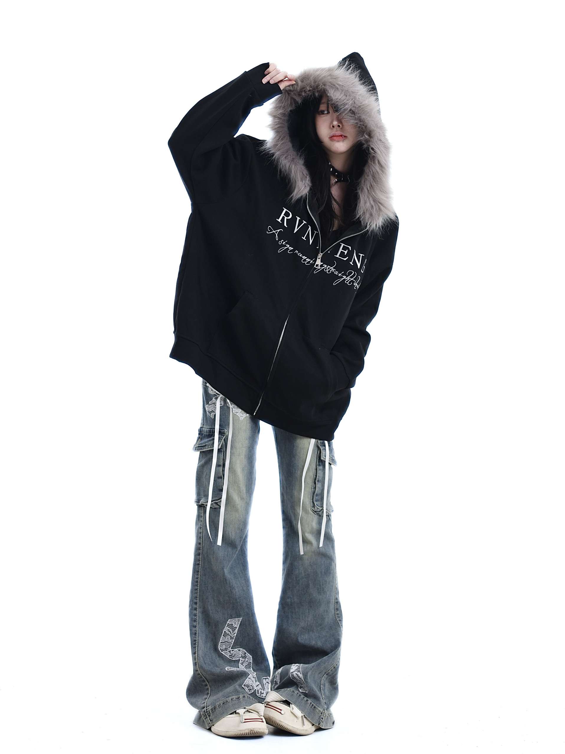RVNTENG Faux Fur Zip-Up Hoodie Black